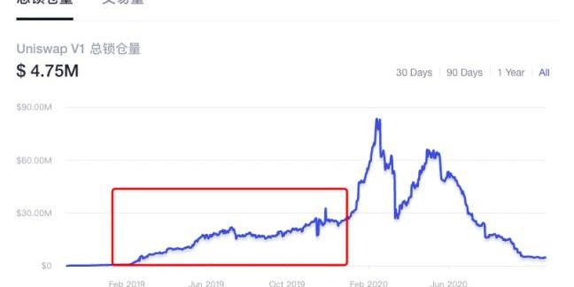 Uniswap2019年总锁仓量大幅增长2019年,以太坊DeFi总锁仓量完成了从2.77亿美元到7.37亿美元的跨越,增幅达到166%。「2018年和2019年间,DeFi经历了雪球越滚越大的过程,为后来的爆发做好了铺垫。」潘超总结道。在文浩看来,正是那两年让DeFi进入真正可用的阶段,稳定币、DEX、借贷类协议不断丰富,组成了DeFi世界的底层生态。当时光走进2019年下半年,缺乏热点的市场开始被DeFi吸引,这个词被提及的频率越来越高。但鲜有人预料到,之后的一年,DeFi以加速度走向市场,掀起了区块链世界的新高潮。