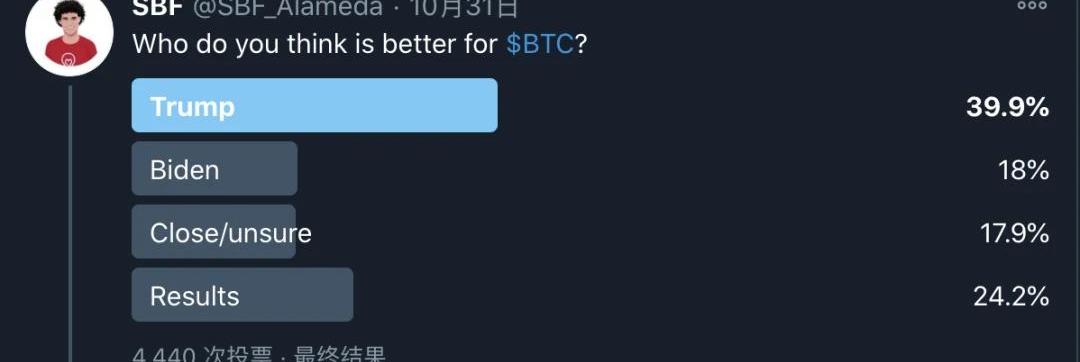尽管特朗普明确表达了对比特币的“厌恶”,但是在加密世界中,人民似乎更喜欢特朗普。无论是FTX创始人还是Coingecko发起的推特投票,都显示人们认为特朗普当选对比特币更有利。