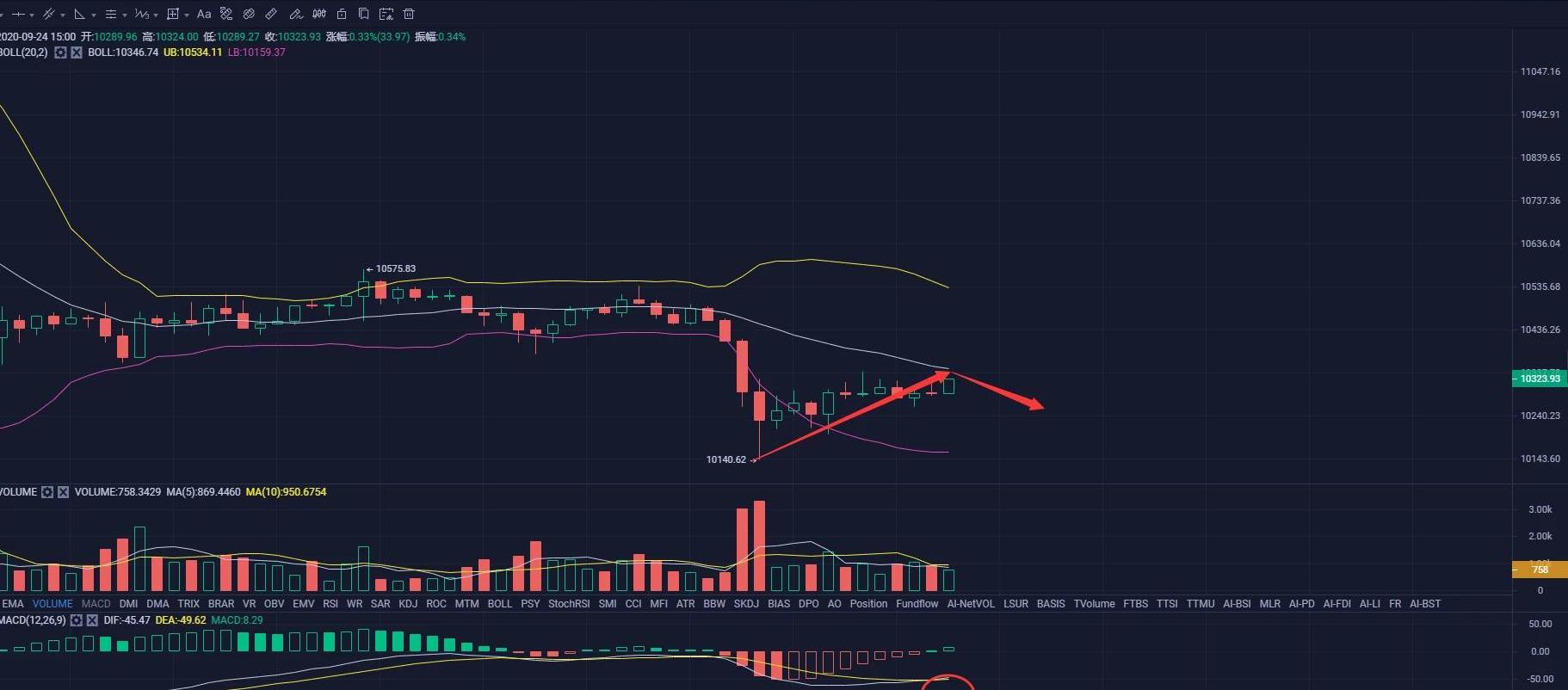 可以看到灰度的买币买币趋势一直保持上升,9月22号持仓量增加了6755份,目前总持仓量为439558,当前灰度资产管理总规模回升至56亿美元。灰度在推高比特币牛市的路上,真的是不留余力。回到行情上,即使昨天行情一度跌破10200美元,但周线级别依然处于Boll中轨上方,且未跌破中轨,所以从中长期来看,还没到最糟糕的时候。日线级别的信号不算太好,昨天彻底跌倒了Boll中轨下方且基本上没有反弹,而macd也正好在0轴下方有形成死叉之势,且柱体从阳转阴,这确实是趋弱的信号。