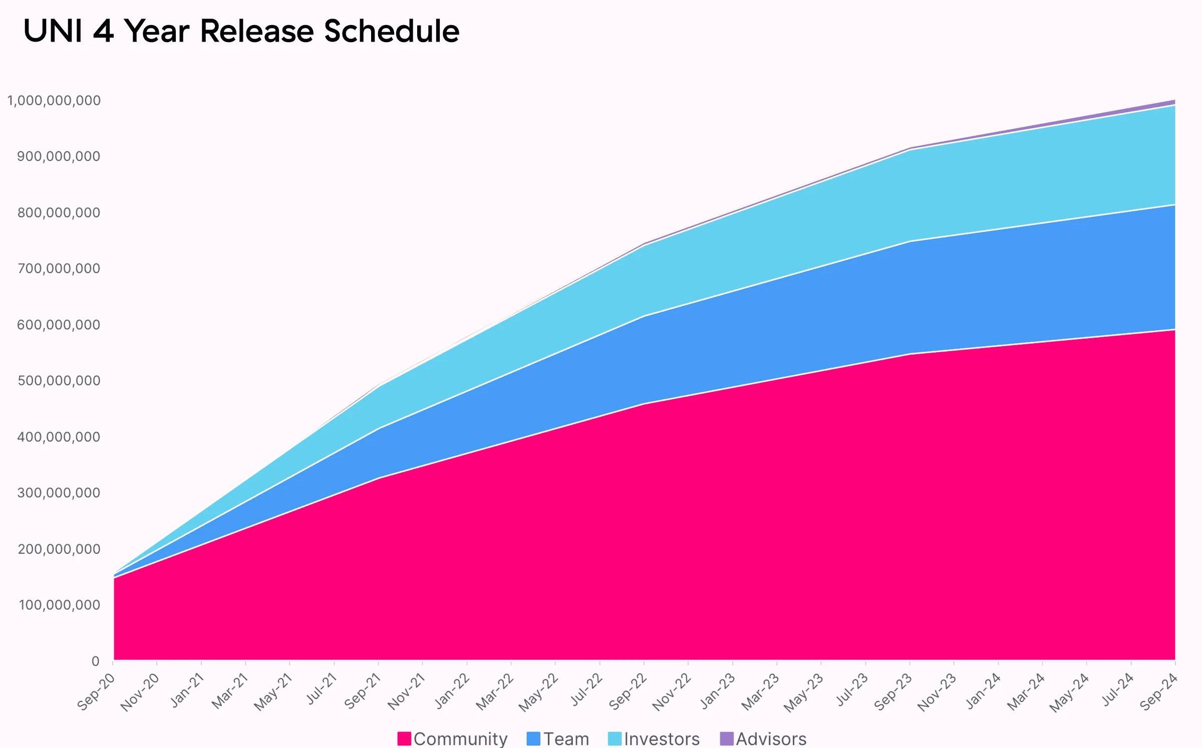 由于历史用户和流动性提供者已经可以领取15%的代币,因此,治理财政部将保留43%的UNI供应,以便通过贡献者赠款,社区倡议,流动性挖矿和其他计划持续分配。UNI将根据以下时间表连续释放给治理财政部。从UTC2020年10月18日上午12:00开始,财政部将可以使用释放的UNI。