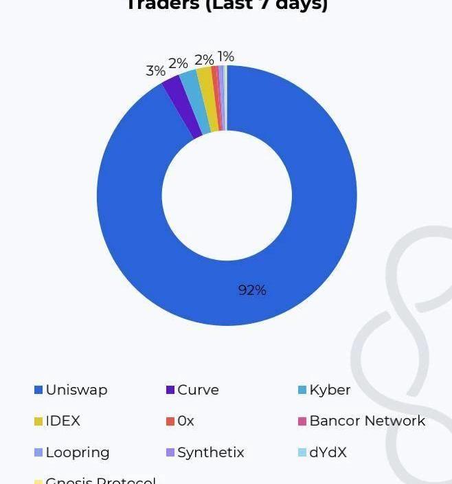 DeFi项目用户30日滚动增长率DEX总览DEX来势汹汹,以Uniswap为首的DEX们吸引了大量的用户并产生了非常可观的交易量。过去一周,Uniswap上有7.6万名独立交易者,占DEX总用户的比例高达92%。