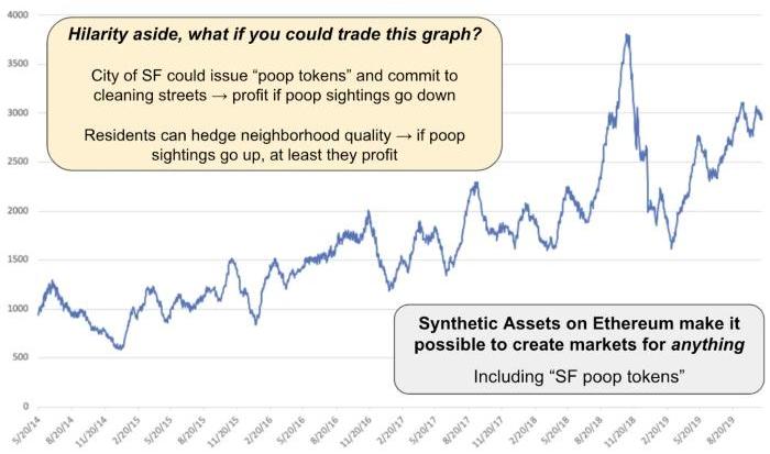2019年末,一些开发者脑洞大开,我们能不能创建一种合成资产来跟踪三藩市内发现便便的频次?然后他们开发出了其原型。代币的持有者在发现更多便便时获利,而发行者则在便便发现量减少时获利,他们共同使用一个报告便便出现频次的信息传输机制。便便交易可以成为三藩市地方政府的激励措施。如果市政府发行便便代币,他们就有动力清理街道以获得报酬。对应的,市民也可以购买便便代币来作为感情对冲,如果街道没变得更干净,至少他们能赚到一点钱。这只是一个简单的例子,但展现了合成资产在各种各样的市场中的潜力。