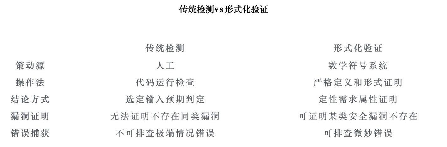 形式化方法是实现安全、可信软件的最可靠的手段,它利用基于数学的符号系统给出软件正确性、安全性的严格定义和形式证明。其中,严格定义被称为形式化规范,是一种用清晰、简明的手段来刻画软件功能或特性的逻辑表达式。在合约审计中,形式化方法通过的是定性需求属性,从而证明程序不存在某类安全漏洞。另一方面,传统测试方法则是通过检查代码在一组选定的输入上是否按照预期运行,以此说明程序是否存在安全漏洞,但这无法证明同类型安全漏洞不存在。此外,传统测试方法很容易漏掉在罕见或恶意构造场景下触发的错误,以及由于大量“不可能事件”连续发生导致的错误。然而,形式化方法则可通过明确代码意图、提供输入空间的完整覆盖来发现上述微妙错误,进而实现程序的安全性、可靠性增强。