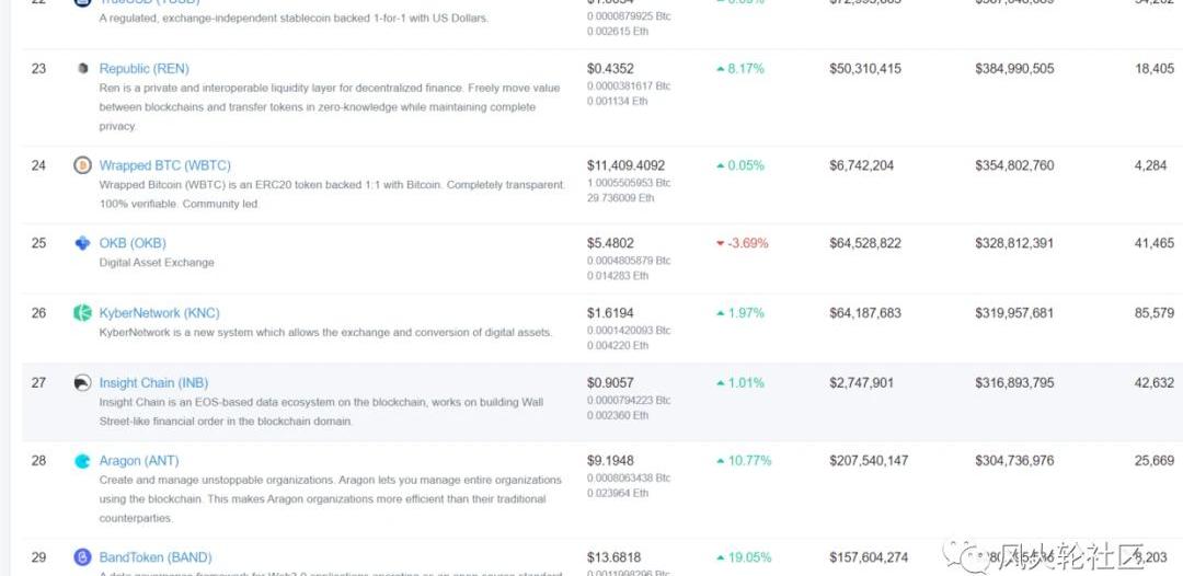 看之前大家都归纳过很多热点板块,比如defi、dao还有存储,也有不少说法认为今年属于山寨的结构板块牛市,说几个目前社群讨论比较多的概念的龙头币的价格表现(数据采集自coingecko):defi的龙头:lend近一年涨幅+183倍,离火币的市值已经相当接近。ren近一年涨幅+4.8倍DAO的龙头:ant近一年涨幅+13.38倍保险:nxm这个新一点,近30天涨幅是+3.85倍预言机:link近一年涨幅+6.39倍存储:AR近30天涨幅+2.43倍而对比以太坊近一年的涨幅是+1.3倍,近30天是+20%,应该说上述在座的各位都是大大跑赢了eth。当然这里没有否定eth的意思哈,以太从312最低点上来也有5倍了,虽说那时的低点只能看看,但也算在主流币中相当强势,这里专门把时间幅度拉长一点来对比,是想说,它更像是一个生态币的牛市,而不仅局限在这些分块概念里,凡是在以太生态中混的,概念上是为生态内提供各种服务的erc20代币都能有不错的表现。之前总有朋友在群里问,有啥财富代码,上面这一段应该就是现阶段财富代码的底层逻辑,哈哈,不信的话,咱们一起打开etherscan.io(需科学):