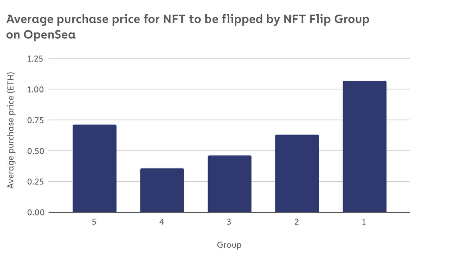 Chainalysis 的调研中除了介绍 NFT 的二级市场发展概况,同时也将 23,000 多个 OpenSea 账号进行分组。分组条件为每一次转售 NFT 的收益率高低。以下图表中,小组 1 为最成功的 NFT 交易组,小组 5 最不成功。小组 2-5 的投资回报倍数线性递减的关系明显,从 1.9 到 0.9。而小组 1 则远高于其它小组:每一次转手 NFT,小组 1 可以获得平均高达 2.9 倍的投资回报率,比小组 2 高出 1 倍。而小组 5 每一次的转售则平均回报率是 0.9,也就是亏损的。我们可以戏谑地将小组 5 称为「韭菜组」了。
