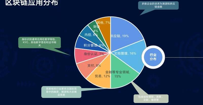 从非企业区块链和企业区块链对比上来看,非企业区块链的融资项目也越来越多。加密货币项目也超过了企业区块链的融资额,说明目前区块链行业还在构建底层基础设施的阶段,资本更多是往底层去的,没有往上层的应用去,只有把底层的基础设施做好,往上层的应用做才能做好。底层基础设施包括什么?包括各个形态基础的公链、联盟链。公链可以支撑数字资产的运行,比如稳定币。目前全球合规的稳定币的数量大概在100多亿美金,如果在全球27亿用户普及,基础建设还会上一个台阶,再过几年稳定币可能到千亿美金级,会有很多人习惯用稳定币做转帐、支付、贸易。从区块链行业应用的分布上来看,供应链金融是最多的场景,也是区块链非常好的落地场景,区块链可以为其提供可保障的信用背书。