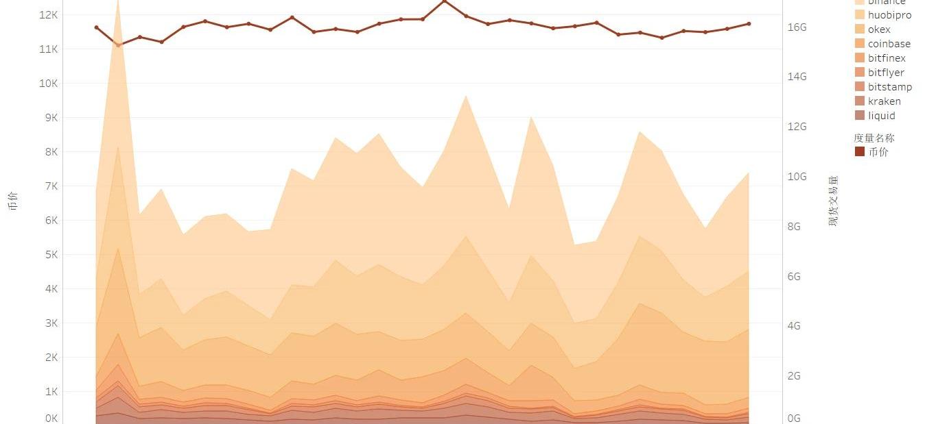 数据来源:QKL123(如4.5中图4-9所示)上图为四大期货交易所8月持仓额与爆仓额概况。从持仓额上来看,可以8月19日为分界线将其分为两个阶段,在该节点之前哪怕历经8月2日币价急剧下跌市场持仓量依旧缓慢上涨,至8月19日(币价创短期新高的后一日)达到短期峰值,之后随币价回撤而下降。从爆仓额上来看,8月整体市场整体情绪多为看涨,8月2日币价急剧下跌导致市场多头大规模爆仓,之后随币价上涨甚至创新高反而并没有发生大规模爆仓;8月下半场币价回撤,爆仓规模逐步缩小,结合持仓量可看出多头持仓在逐步撤退。4.4现货交易所图4-8现货交易所成交量