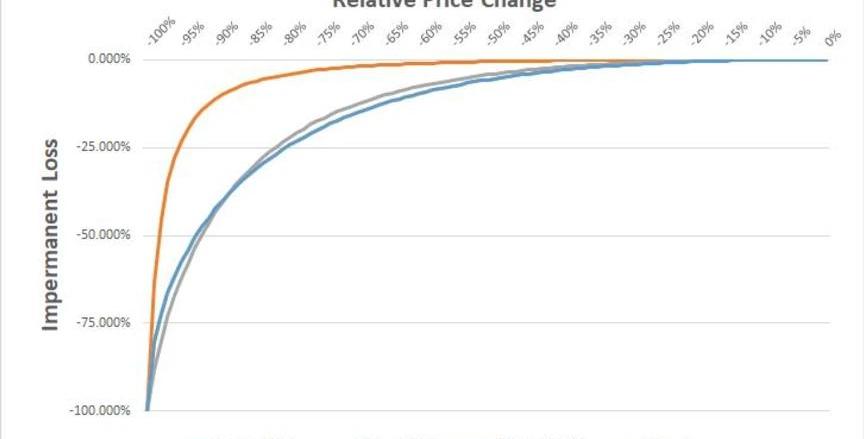 从YIP-8提案分叉出YFII以来,各种参考YFI的币层出不穷,其中有一些已经归零了,也有一些就是单纯的,也有像YFII这样仍然顽强发展,币价稳定,走出了独立创新的业务模式、社区越来越大的。无论成功与否,毫无疑问的是,YFI的故事和它的代币分发模型,是可以复制的。我们再来回看一下YFI的模型核心:Pool1:传统糖果池,通过稳定币挖矿获得,理论除去合约风险没有风险项目的机池)Pool2&3:Ponzinomic模式的流动性池,有无常损失直接本金归零风险这里解释一下无常损失,去中心化交易所的AMM机制这里就不多介绍了,直接说结论:问:什么是无常损失?答:就是什么币涨了,你的什么币就没有了;什么币跌了/归零了,你就一手的纪念币。所以「无常损失」也被戏称为「无偿」损失。光定性分析是不够的,我们定量分析一下「无常损失」: