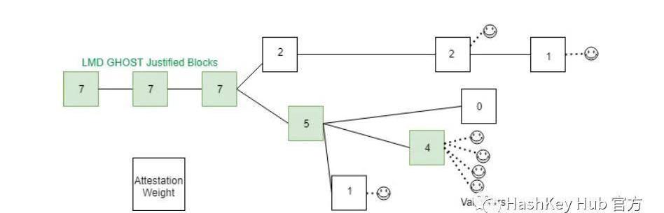 以太坊2.0有四个需要解决的问题:分叉选择、最终性、分片、验证者责任。并分别用不同的技术和制度手段去实现。分叉选择-保证安全性以太坊2.0使用LMDGHOST(「LatestMessageDrivenGreedyHeaviest-ObservedSub-Tree」)作为分叉选择。这里面包含了两个协议:LMD和Ghost:Ghost是一个在PoW链上就非常应用成熟的协议,是一种最长链的原则,和BTC上的最长链原则相比,Ghost选择子树最多的协议,所以最长的链未必是Ghost所选的链。相比最长链原则,Ghost原则可以做到:1收敛;2抗51%攻击;3TPS和最长链差不多,但是安全性没有下降。Ghost协议也是目前以太坊1.0所使用的协议。LMD是在2.0新加入的分叉原则,和Ghost一起构成了LMDGHOST。LMD就是指最新的消息。由于在2.0中采用PoS加入了验证者的角色,最新的消息就是指更多验证者的证明,就是在Ghost原则里,再加入更多验证者的证明(attestation),这就使得最长的链变成权威链,根据Casper协议拥有最终确定性。