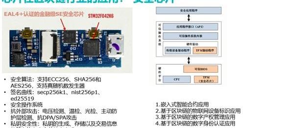 最基本的是安全芯片,左上角是产品,当中有MCU、符合金融级认证的安全芯片。一般来说,会在当中支持安全算法,包括ECC256、SHA256和AES256,很重要的是支持真随机数发生器,芯片能保证发生随机数是真随机,区块链的安全都是建立在密钥安全性上。包括支持各种签名曲线、安全操作系统、抗外部攻击。私钥的安全性非常重要,包括生存、存储以及交易信息时保证运算都在安全芯片里运行。在上面的右图是比较完整的系统,包含安全芯片、操作系统、硬件平台等。应用领域蛮多的,像数字资产安全存放、智能合约应用、物联网设备标识、身份认证等,我认为安全芯片是区块链里的基石。加速器