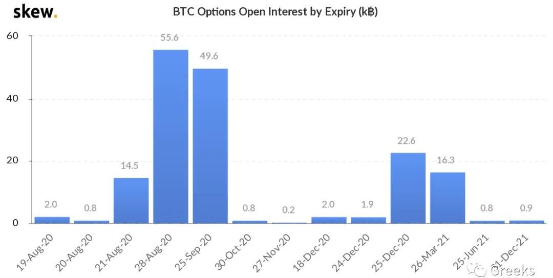 偏度:今日:1m+5.9%,3m+9.3%,6m+15.8%8/18:1m+7.9%,3m+9.3%,6m+13.8%短期skew正在回落,中远期看涨期权反而上升。Skew走势与之前几天完全不同,远期skew已经重回了历史高位。
