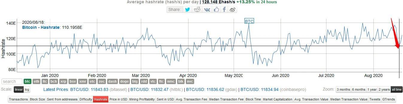 3、比特币全网近1日平均算力已跌至111.49EH/s8月18日前后,由于四川省暴雨天气频发,乐山、阿坝等地汛情严重,部署在四川地区的矿场算力均有不同程度下跌。据BTC.com数据,F2Pool单日最大跌幅达21.14%,BTC.com跌幅最小,为5.92%,全网近一日平均算力已跌至111.49EH/s。Bitinfocharts的数据也显示了全网算力下降,算力从136.9EH/s下降到115.84EH/s,24h跌幅11.59%。一方面洪水、泥石流导致网络与电力中断,导致全网比特币实时算力暴跌,主流矿池中算力平均下跌10%-20%。另一方面在洪峰过境时,为确保矿场运营人员安全而提前撤离。