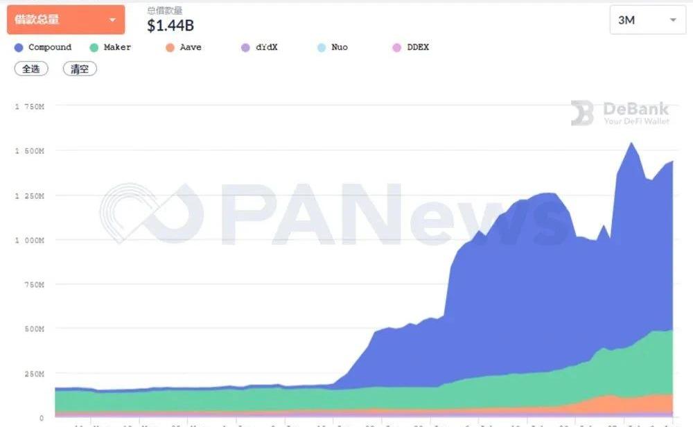 去中心化借贷市场在7月份继续维持了非常高的增长速度,总借款量在这一个月内增长了121%。以太坊上的抵押借贷市场由Compound和Maker牢牢把控,这两个平台的市场占有率之和达到了90%以上。6月份才开始崛起的Compound,才是这其中真正的霸主。Compound中借贷量的增长并没有引起投资者的热情,在这一个月里,其治理代币COMP的价格接近腰斩,创下新低。在上一个月的DeFi月报中PANews也提到COMP可能存在泡沫,前期流通量的不足可能过高的推升了COMP的价格。并且,借贷市场的借款或存款并没能完全反应产品的使用情况。为了获取平台的治理代币,同一个人可能对同一币种进行反复存款、贷款。以DAI为例,目前DAI的总供应量只有3.8亿,而Compound中DAI的存款就有10.6亿,这意味着有相当多的DAI被用于在Compound中反复的存款、贷款。