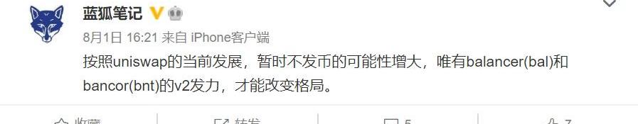加密货币投资机构MapleLeafCapital,曾表示:尽管COMP、BAL和CRV很火热,但LEND、BNT和REN可能会推动从纯粹治理到价值捕捉的化学性变化。对于DEX中的投资机会,表示:DeFi流动性资金池/自动化做市商:BAL不值得投资,CRV太贵,BNT值得一试MapleLeafCapital看好BNT的理由和BNT存在的风险:Bancorv2:1个代币+BNT,任意比率,可调曲线+Chainlink,可变费率,存时可贷。BNT代币作为AMM的储备代币,按比例赚取交易费+赚取新发行的BNT。在通货膨胀、费用和利息上下注非常诱人。价值捕获模型的变化与有可能出现的催化剂+当今DeFi代币中最低的市值,使其成为一个非常好的标的。困难在于Bancor团队不是DeFi黑帮的成员,所以可能热度高不起来。还有一点不清楚的是市场指标和总代币供应。BancorV2的热度在推特上微博上,是两种状态。在推特上搜索BancorV2能看到不少关于它的信息,一些宣传图片也做的有意思,如下图。