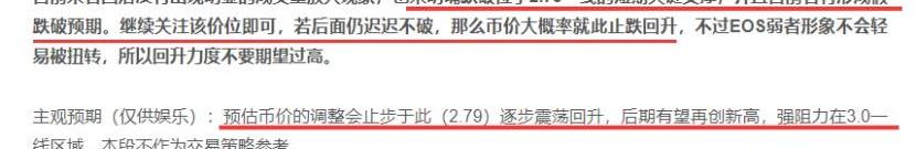各级别性质:日线-下跌,4小时-上涨,1小时-上涨截图来自OKEXEOS/USDT永续合约1小时图:目前的客观走势及应对策略:EOS昨晚至今的走势也算非常符合我们昨天晚评的预判了,当时写晚评时币价刚好跌至我们之前划定的短期强弱分界2.79,而晚评中的判断是币价大概率会在这里止跌回升。同时也给出了关键阻力3.0,而止跌后的第一波冲高受阻的位置就是3.0一线,运气有好到爆棚~