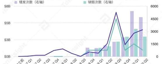 近年来稳定币的市值增长情况从区块链分析网站StablecoinIndex的数据来看,USDT在其中贡献了绝大部分的增长数额。年初至今,Tether至少对USDT进行了53次增发,共计发行逾45.5亿USDT,为该稳定币种当前总流通量的49.5%。其中第二季度增发更为频繁,累计发行超27.3亿USDT,环比增长51%。
