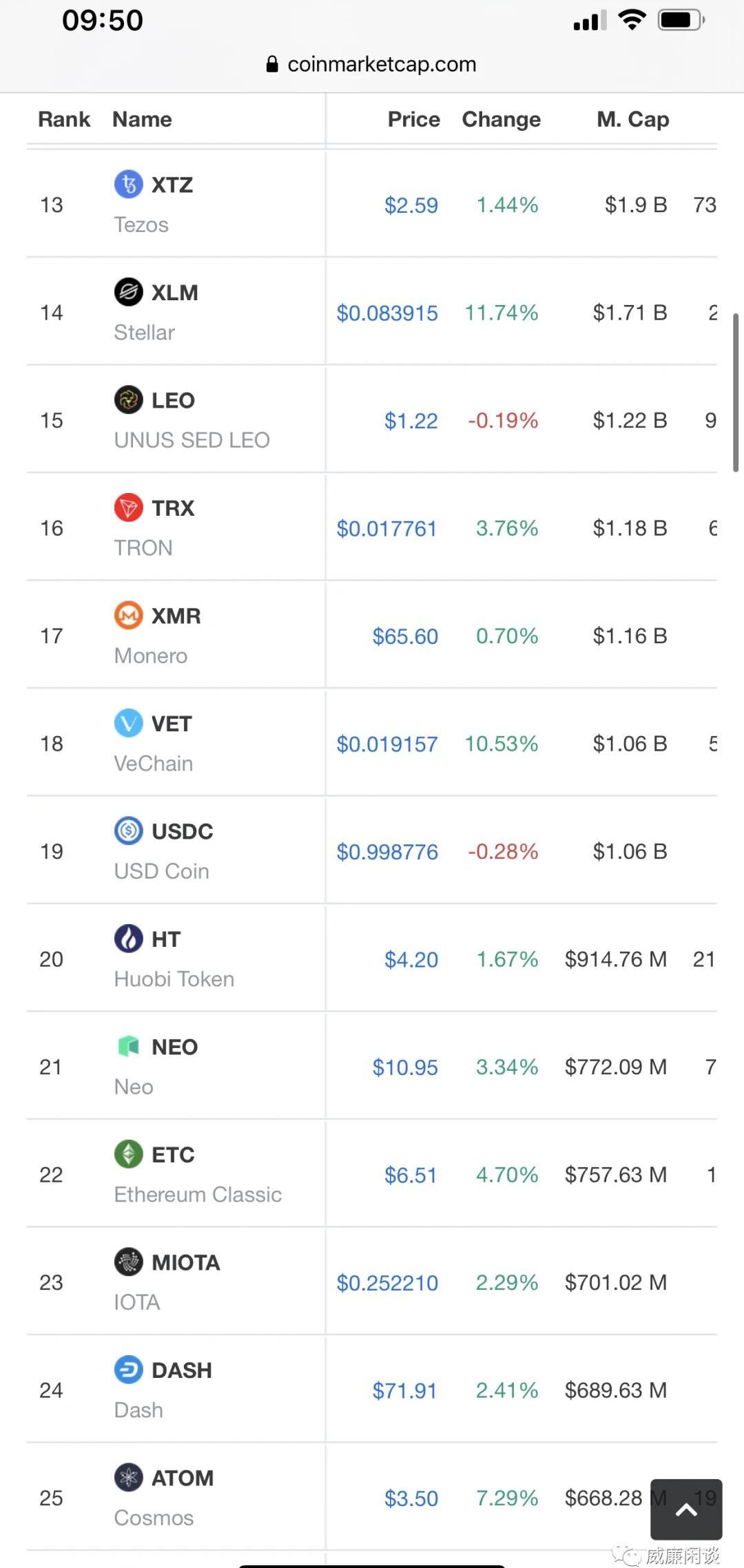 比特币和以太坊的老大和老二位置十分稳固,多说一句,这一年多时间里比特币价格从4000+到了9000+,还是比较优秀的。令人比较意外的是USDT疯狂输出之后,来到了第三名的位置。另外XLM恒星币和门罗币XMR还有波场都消失在这里了,跌出去了,甚是惨烈。比较而顶替他们位置出现在市值前列的是CRO,还有这两年最大的明星币Link和XTZ。ChainLink我没持有,所以没有利益相关。但是说实话挺遗憾的,这个币在过去大概一年多时间里听到了很多人的推荐,但是我愣是觉得它太贵了,一直没有上车。不过还是那句话,我清楚自己赚钱的边界,所以虽然遗憾,但是也不FOMO。这是好币,但是我仍然觉得目前太贵了,尽管它的支持者们坚持认为它是未来的前十。其实理论上来讲,它只要超越EOS就可以了,拭目以待吧。值得夸赞的还是XTZ,Tezos这个项目在19年翻身之前是恶评满满的,负面缠身,没有希望。但是19年带着Staking概念卷土重来,直接点火了一波概念,自己也不断起飞。一个优秀的项目,的确是能够经历最难熬的阶段,最后凤凰涅槃。如果你持有的项目目前很惨,但是团队还有钱,还努力,那你或许还可以持有希望。另外BNB也很优秀,作为19年的牛市发动机,币安去年真的做的很棒,但是今年就比较一般了,OKB和HT今年的表现都优于BNB,希望多多加油.接下来,咱必须得批评几个主流币,实在是不争气。在BTC价格从4142美金到9400美金的过程中,这几个主流的价格表现如下,给你们批评吧:XRP:0.33--0.2EOS:4.27--2.65LTC:51.68--44.93以上,就是市值前列的币种盘点。基本上市值前列的主流币种们也算是经历了一轮洗牌,再过一段时间进场的新人们,估计心中的“主流币”和你们心中的“主流币”就不是一个概念了。建议各位看完解读再回去多看几秒前后市值排行的对比,多品一品,或许你能品出币圈的一些大道理。接下来是市值14到26的币种:这是19年2月: