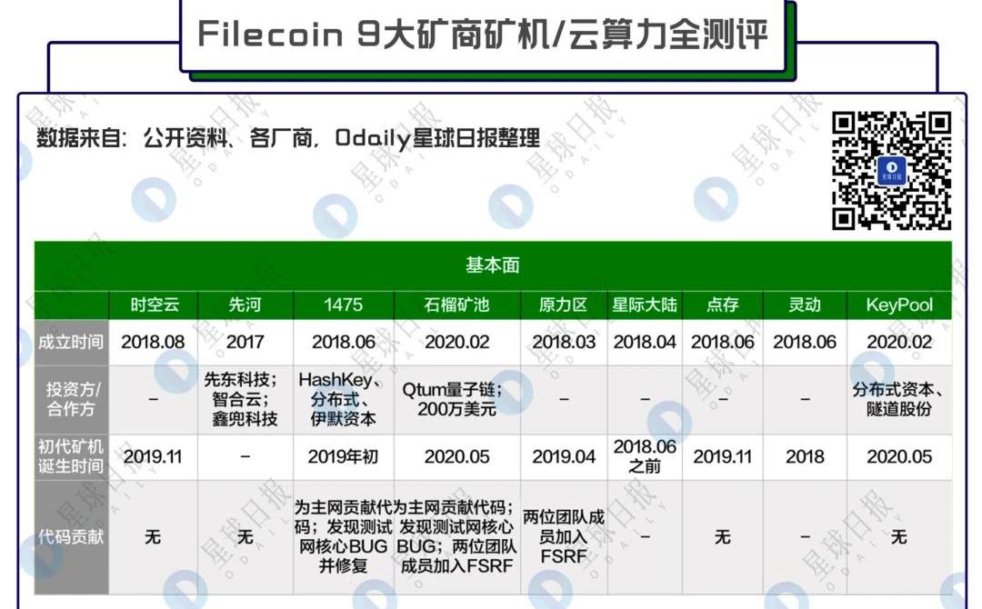 从成立时间看,除了石榴矿池、KeyPool之外,其余矿商均在2018年中成立。Filecoin曾预计和EOS同时上线主网,谁料,这一“鸽”就是两年,着实难为了“应运而生”的矿商们。为了生存,矿商们发售了不少“假矿机”。如星际大陆、西安灵动、1475和原力区早在2018-2019年上半年就推出首批矿机,悉数采用了不适合当前挖矿算法的Intel处理器,挖矿效率低下甚至无法直接运行。矿商们如何解决这一遗留问题,会在下文“风险点”部分详述。再看投资方和合作方。在9大矿商公开可查的资料中,有三家对外募资,包括1475、今年刚成立的石榴矿池和KeyPool。2020年4月,1475宣布获得HashKeyCapital、分布式资本、伊默资本注资,投后估值4亿元。6月,量子链宣布完成了对石榴矿池200万美元的天使投资。而KeyPool母公司,企业级加密资产服务商Keystore则在今年1月份获得建元基金、分布式资本千万美元投资。相较于资本,对于矿商而言更为重要的是技术能力。对于这点,我们可以矿商是否参与主网/测试网代码贡献来侧面验证。代码贡献方面,原力区、石榴矿池分别有多位技术人员为官方代码库做过贡献,同时分别有两名团队成员受邀加入Filecoin安全研究小组,1475、石榴矿池均向官方提交过测试网核心BUG。总体而言,原力区、1475和石榴矿池参与主网开发、积极寻找BUG,技术实力有目共睹;同时,1475、石榴矿池和KeyPool获得了知名币圈TokenFund背书,对于币链矿圈的投资者是为加分项。矿机性能&性价比接着来看最为硬核的矿机/云算力性能比拼。因上述矿商中,先河系统未直接面向散户出售产品,原力区和KeyPool只出售云算力,因此下表对其余6大矿商矿机的15个剖面逐一比较。如果你准备在最近购入矿机,这张图无疑会成为你的好帮手。