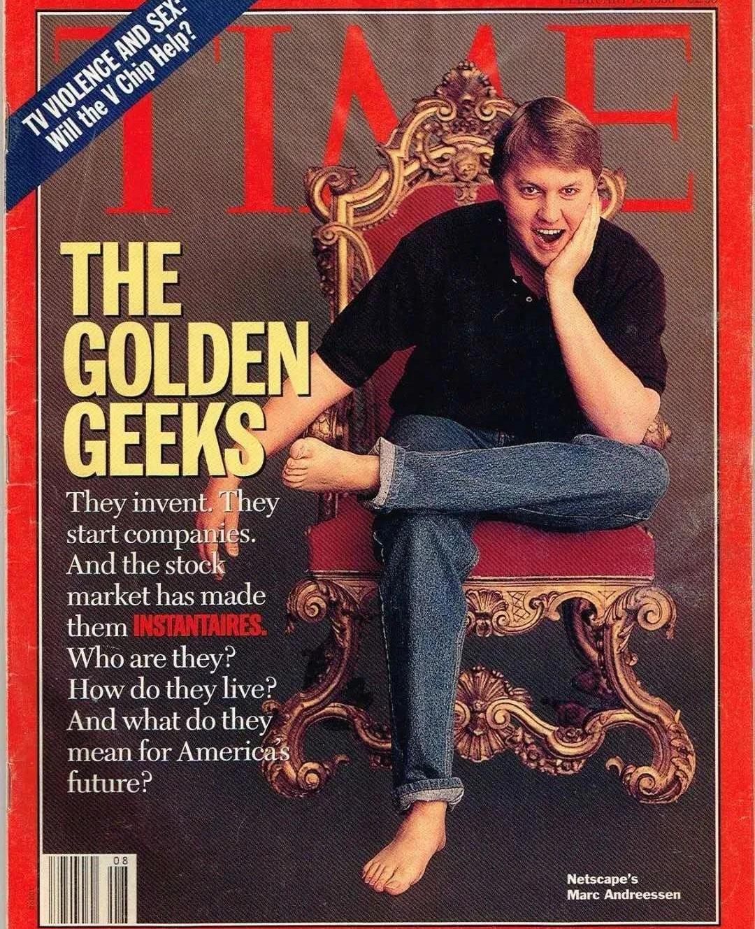 图:MarcAndreessen和BenHorowitzMarcAndreessen不仅是一位技术天才,更是硅谷创业的神话。1991年,WorldWideWeb万维网问世,但当时的浏览器并不好用。于是,还在上大学的MarcAndreessen和同学一起开发了一款简单易用的图形化浏览器——Mosaic,不仅支持图形和动画,还可以播放声音,显示各种颜色,并开创性地引入了书签和浏览历史的功能。短短一个月时间,这款浏览器的用户数量就突破了一万。1994年,美国计算机科学家JamesClark投资了400万美元,邀请刚刚大学毕业的MarcAndreessen一同创业,两人共同创办了网景通信公司,并推出了改良后的浏览器——NetscapeNavigator。1995年,Navigator浏览器拥有了200万用户,网景通信公司也成功上市,上市当天股价一路飙升,从28美元每股涨至75美元每股,公司市值一度高达30亿美金。作为创始人的MarcAndreessen登上了《时代》杂志的封面人物,风头甚至盖过了微软的创始人比尔·盖茨。