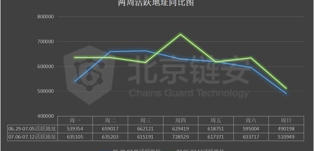 活跃地址数:06.29-07.05:419386407.06-07.12:4376065较之前一周上涨:4.34%详细数据图如下: