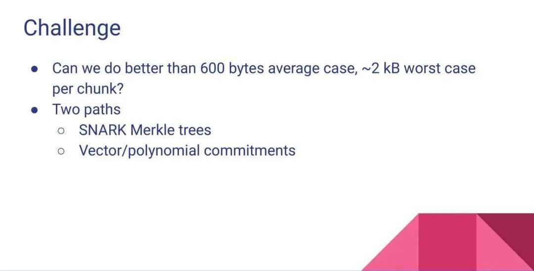 该部分介绍了实现无状态客户端的困难所在。一方面,witness的数据规模较大,安装此处的估算,每个区块会产生600KB的区块witness数据。另一方面,则是因为EVM操作码的Gas消耗量都是根据操作的计算量来决定的,根本不适合无状态范式以带宽消耗为主的情况。所以,总的来说,实现无状态性的挑战一方面在于要降低witness的大小,另一方面是制定出一套与之相适应的Gas消耗量方案。