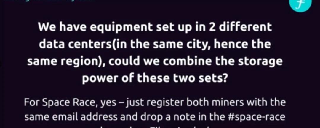 问题八:我们在同一个区域内两个不同的数据中心安装了设备,我们能把两套设备的存储能力结合起来吗?答:对于大矿工来说,可以的,只要你是使用相同电子邮件注册的两位矿工,你需要按照Filecoin中的slack中的space-race频道中给出相关的说明操作就行了。