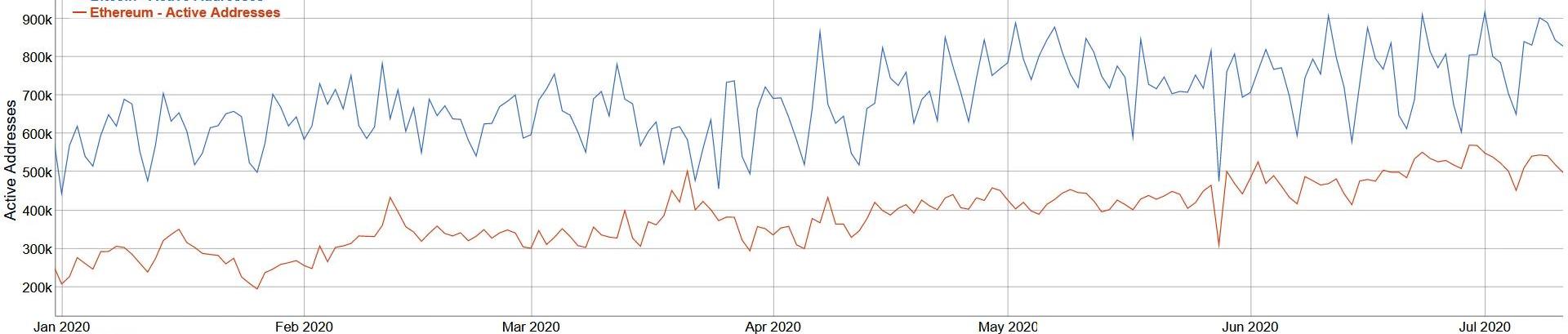 为什么转向以太坊的人多于比特币?一个明显的答案——以太坊是顶级去中心化金融应用的所在地。到6月初,以太坊上DeFi应用的兴起使以太坊区块链的唯一地址总数超过了1亿个。Dapp.com在7月的一份报告中估计,DeFi应用占以太坊所有Dapp量的97%以上。1亿这个数字代表了以太坊交易中使用的每个唯一地址,包括发送者和接受者。显然,这并不能体现那些使用多个地址的用户,因此也不能完全反映以太坊用户群的增长。但是,来自Bitinfocharts的数据会跟踪来自唯一的以太坊地址的交易。如下所示,自1月1日以来,活跃以太坊地址增长了160%,从208,392上升至542,458个。