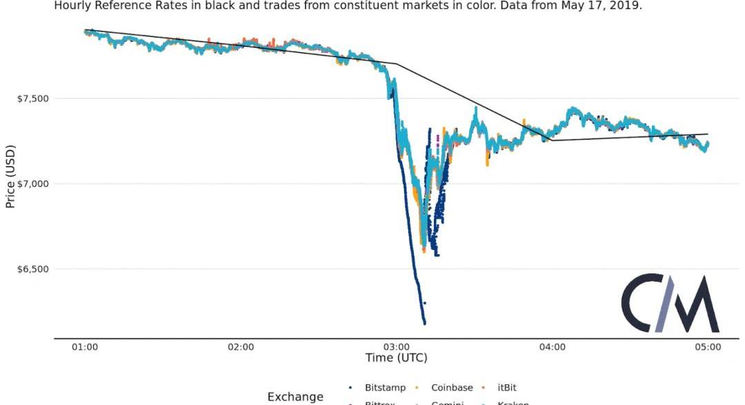 由于追溯时间长,CoinMetrics的每小时参考汇率不受影响。CoinMetrics的实时参考汇率正确地跟踪了市场价格,不包括Bitstamp上的额外下跌。