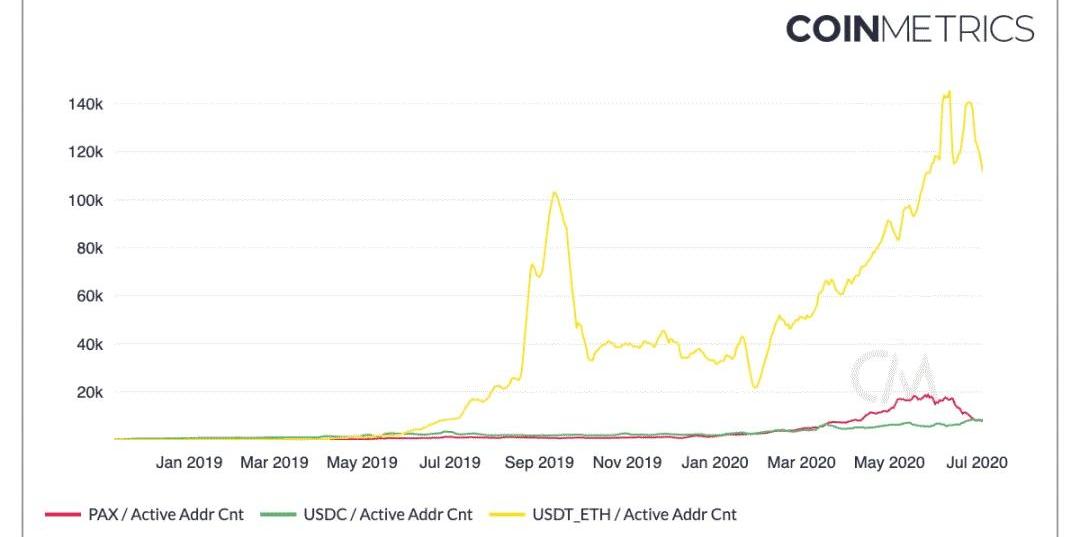 ETH在过去的七天里,都有超过50万个活跃地址。这种情况只发生在ETH历史上的另外一个时期——2018年1月,当时ETH的价格飙升至1400多美元的历史新高。然而,当前的活跃地址激增并不是由ETH价格峰值驱动的,因为自2月份以来,ETH的价格一直保持在250美元以下。相反,它似乎是由基于以太坊的稳定币和去中心化金融的快速增长所驱动的。ERC-20代币是在以太坊区块链上发行的,可以作为衡量以太坊上活动的代表。虽然远非全貌,但流行的ERC-20的活跃度可以揭示整个网络的使用趋势。下图显示了三种以太坊发行的稳定币的活跃地址数。Tether(USDT_ETH)、USD币(USDC)和Paxos(PAX)。自3月以来,这三个币的活跃地址都有大幅增长,其中USDT_ETH以巨大的优势领先。但尽管增长迅速,USDT_ETH的活跃地址似乎在6月达到了顶峰,进入7月后有所下降。PAX活跃地址也在6月初达到峰值,此后一直在下降。不过,并非所有的稳定币都在下降。USDC活跃地址自3月以来相对稳定增长,目前已达到历史新高。