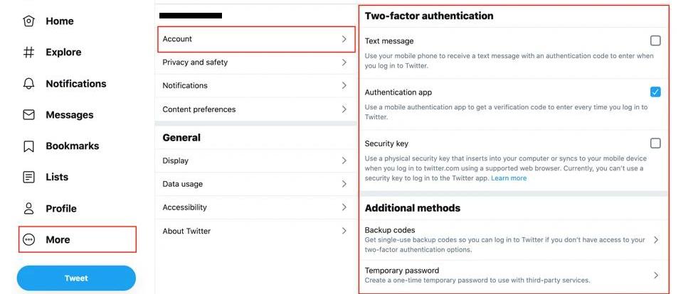 2.开启二次验证登陆Twitter后,在More->Settingsandprivacy->Account->Security->Two-factorauthentication界面开启二次验证,二次验证的方法有手机短信,GoogleAuthenticationapp,和物理形式的SecurityKey。使用二次验证可以防止黑客在接触到用户的账号密码的情况下,盗取用户账号。
