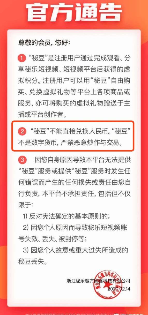 也就是说,官方完全可以操纵秘豆的价格。看到这里,你总该明白秘乐和抖音的模式完全不是一回事儿,抖音的抖币价格是固定的,但是秘乐的秘宝却具有极大的炒作空间。‘我们国家早有明文规定,不允许发行或者炒作虚拟货币。而秘乐2.0利用秘宝替秘豆打掩护,这就高枕无忧了吗?错!秘乐2.0仍然是在变相地违反相关法律法规。秘乐短视频的用户规模还在不断扩张,甚至还侵蚀到了学校里面。鉴叔估计,过不了多久注册用户数就会突破5000万。