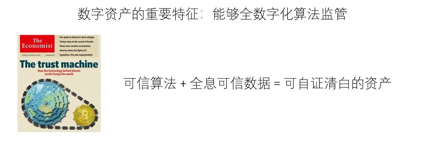 刚才腾讯演讲嘉宾提到3月份中共中央国务院推出的要素市场化政策,还有很多事情正在发生。不管你怎么看,好像在这个中间有一个名词正在越来越突出,就是数字资产,数字资产似乎正在走向这个舞台的中央。但就跟以前我们经历过的很多事情一样,当一个词正在成为热点的过程当中,往往人们对它还没有形成共识。到底什么是数字资产,很多问题大家没有形成共识,讲不清楚。我们数字资产研究院是专门研究数字资产的,但感觉到现在为止,恐怕还没有能形成一个清晰的、简洁的,能够赢得所有人共识的数字资产定义,可能还需要更多的时间,更多的经验,更多的实践,才能够慢慢认识到什么是数字资产。但是,至少我们知道什么不是。比如以前我们经常觉得数字资产是去中心化的,必须是区块链上的东西才叫数字资产。比如微信和支付宝,里面都有余额,但很少有人说这个是数字资产,更多人承认它是电子货币,不太承认是数字资产。我们真的认为中心化的就不能是数字资产吗,央行的数字货币也是中心化的,难道不是数字资产吗?反过来,去中心化的就一定是数字资产吗?固然比特币是数字资产,这个是大家已经公认的,但我们也要知道在过去几年当中,去中心化世界里产生了大量的空气币,这些也配叫数字资产吗?究竟什么是数字资产呢?就像我刚才所说的,也许我们现在还没有到一个时机说可以总结出一个清晰的数字资产定义。但也许我们可以从已经发生的一些事情当中,来思考一下数字资产具有什么样的特征。就拿最近非常火的DeFi来说,前不久我写了一篇文章谈DeFi一个著名的项目,Compound。在里面我批评了一件事,现在这么多的DeFi项目,已经有将近上百个了,而且越来越多,在我看来它们都是在空中飞舞,在空中摆出各种各样漂亮的姿势,用算法做出各种各样精致的构建,但就是脚不沾地。我这个观点发布之后,很多朋友私下跟我探讨,这个观点确实是对的,也认为是DeFi的问题。但是反过来说,DeFi恰恰因为没有触碰现实世界,反而具有天然的透明性,天然的可信性,这是DeFi和以前行业里流行的空气币最不一样的地方。我也思考这个观点,说的有道理。现在的DeFi项目绝大多数——除了最新少数几个之外,都是极力把自己蜷缩在所谓安全算法区里。它用各种各样算法设计,来规避去触碰现实世界,它不想和现实世界发生关系,不想让现实世界中心化机构证明资产的可信度或者风险度。希望它的资产风险以及质量能够用算法进行计算和推导,我称其为算法安全区,就是有那么一个边界,所有的DeFi项目,绝大多数都躲在这个边界里面,内卷式发展,相互竞争,相互斗智斗勇,但不愿意去触碰边界外面的真实世界。在批评这件事情同时,我也必须得承认,恰恰因为他们不愿意触碰现实世界,也因此具有了跨组织、跨文化、跨边界、跨国家的能力,因为在这个世外桃源当中,人们是基于数学和密码学相互信任的。是不是可以从这个现象得出一个小小的启发呢?是不是我们嘴里所谈的数字资产有一个很重要的特征,或者就算今天还不是这样一个特征,至少是未来一个很重要的目标,是要承认全数字化监管的资产?什么叫全数字化监管呢?我们用公开透明的可信算法,加上全息的可信数据。大家都知道这样的可信数据最好存在哪里——区块链上。这样的算法最好是表现在什么形式上——智能合约。我们结合这些方面,然后完全在计算的能力之内去衡量和测量一个资产的质量和它的风险。注意,不是说这样所产生的数字资产是绝对安全的,世界上没有绝对安全的数字资产。至少它的透明度,它的质量风险是可以快速计算的。如果能够做到这一点,实际上就实现了大家都见过的这个封面——当年区块链刚刚开始崛起时,《经济学人》杂志登的封面“信任的机器”。什么叫信任的机器?这样一台可信计算机,只要通过计算就可以产生信任,这是当时人们对于区块链这件事情的愿景。