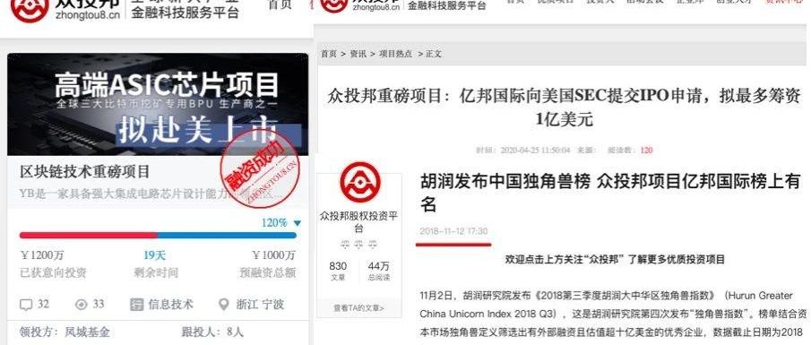 图源:蓝鲸财经根据网页快照信息显示,2018年上半年,一个“区块链技术重磅项目”登陆众投邦,“高端ASIC芯片项目拟赴美上市”、“YB是一家具备强大集成电路……”的字眼让人浮想联翩,你或许已经猜到了,这家企业就是亿邦国际。众投邦的官方账号也多次发布亿邦国际的相关信息为其造势,比如《股权投资的传奇——1年内净利润从1110万到3.85亿》、《胡润发布中国独角兽榜:众投邦项目亿邦国际榜上有名》……2019年8月,众邦投董事长朱鹏炜更是亲自带领一众投资人考察“高端ASIC芯片”项目,地址与浙江亿邦通信科技有限公司的办公地址一致。