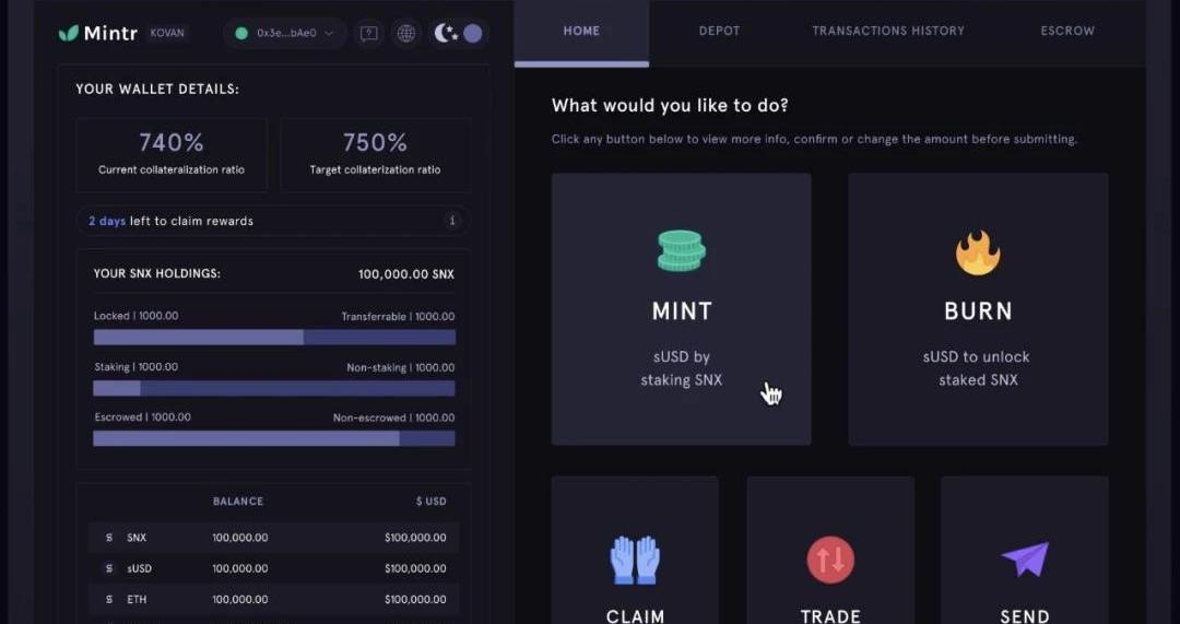 (Mintr)Mintr是一款为SNX持有者提供的DApp,它允许他们在SynthetixNetwork中进行各种操作,包括。铸造和销毁合成资产Synths管理其抵押率收取流通合成资产所产生的费用将sUSD发送至卖出队列查看他们的余额和Mintr历史解锁托管的SNX还有很多其他功能使用Mintr就如数123一样简单,因为DApp有一个简洁直观的界面。要开始使用Mintr,只需连接一个包含SNX代币的钱包。接下来,点击"铸币Mint",并决定你想多少数量和什么样的合成资产。现在,你就可以使用新的合成资产进行交易,或将剩余的SNX进行质押,用来获得每周的奖励。6.在哪里存储SNX代币?