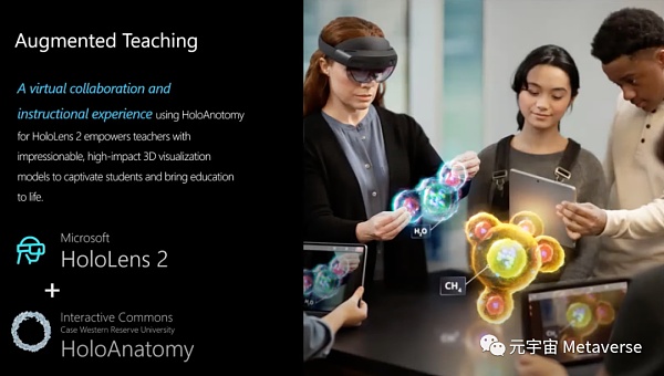 增强教学:指混合现实运用与医学生学习与培训。这个场景是是HoloLens2技术与交互式HoloAnatomy应用程序的组合。
