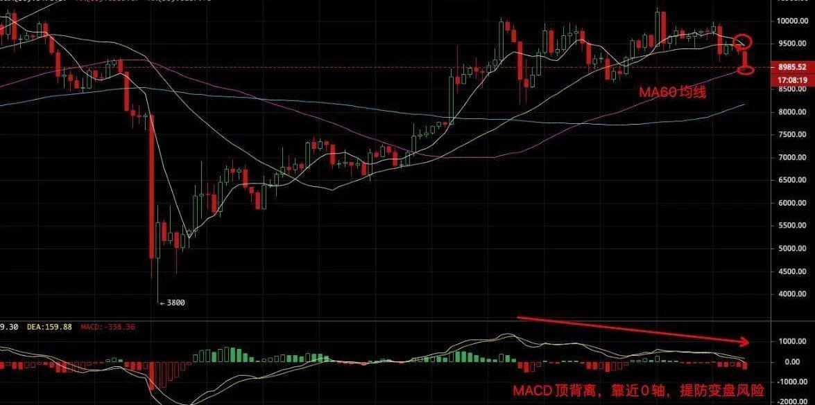 早行情提到目前的圆弧顶走势,如果没有强力反弹,很容易造成二次探底的风险,目前的走势差不多是这样,币价呈抛物线下跌,这种走势下,只能看能在哪个价位止跌企稳,4小时级别的支撑在8500美金,4月底以来冲击10000美金后,两次探底的底部区间。不破这一区间,还是可以看做震荡走势,不必过于恐慌。