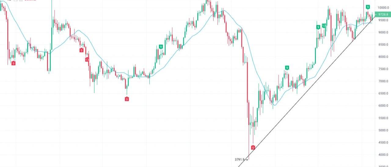 截图来自OKExBTC/USDT现货价格日K线图,上周整体呈现冲高回落的走势,期间两度拉升,上周二再现“门图行情”,最高价突破10000美元,随后快速回落。周四再度走高突破9800美元,周五至周末连续回调三个交易日后,截止本周一,BTC现货价格报9700美元附近。从下图技术形态来看,日线级别币价依然位于上涨趋势线上方运行,上方10000美元继续承压,整体呈现三角型逐步收敛的形态,距离行情变盘给出方向越来越近。指标来看,MA20继续呈水平,短期TD指标出现绿色序列9,多空在该位展开博弈。