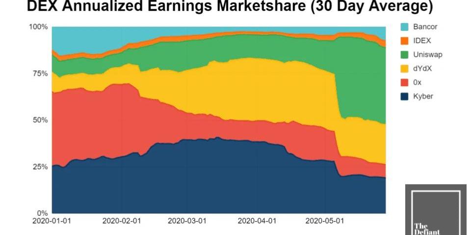 由TokenTerminal跟踪的主要DEX——Bancor、IDEX、Uniswap、dYdX、0x和Kyber,预计年化收益将达到1200万美元,创下今年的新高。对于DEX来说,收益主要由交易量驱动,因为平台通常会抽取交易者支付的部分费用。此前的高点是3月份,当时由于黑色星期四和金融市场的不确定性,交易量激增。