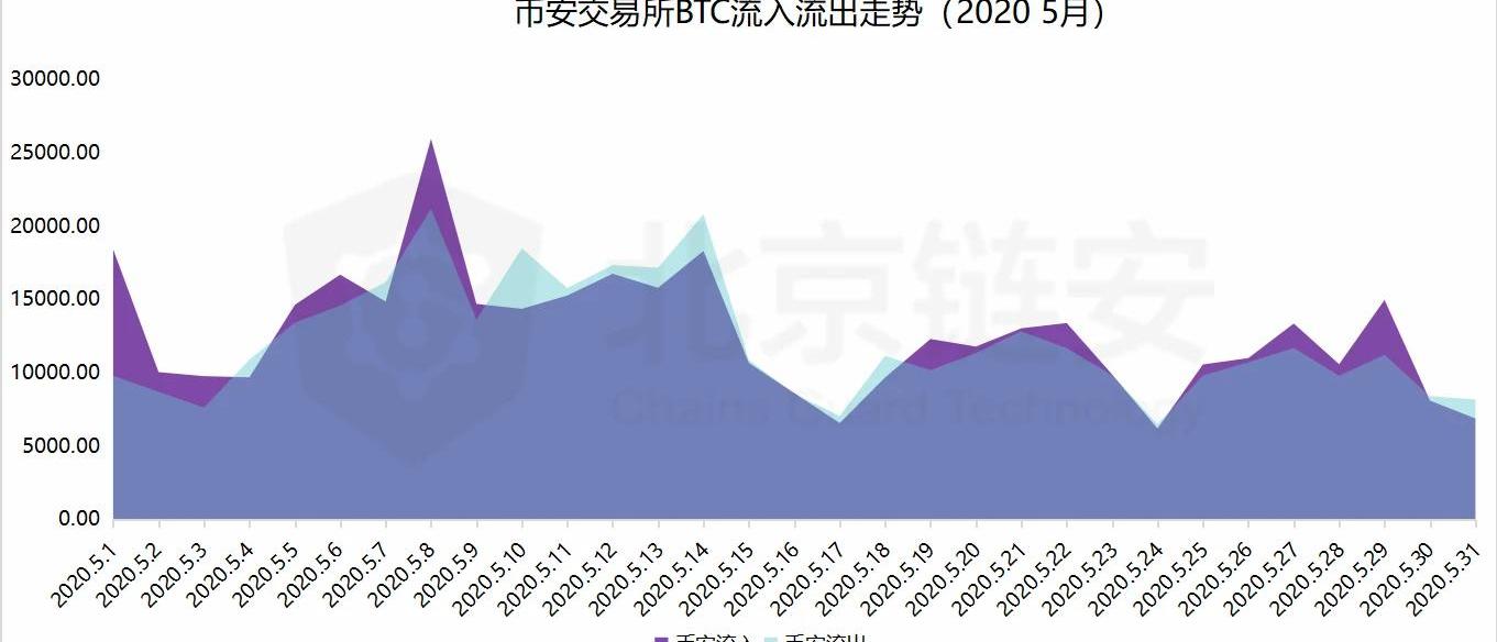从2020年5月的31个自然日币安比特币净流入和币价对比来看,趋势更为明显,币安比特币净流入主要发生在月初的价格攀升阶段,此后,比特币进入10000美元下的震荡期,其比特币的流入和流出在下半月整体呈现一种相对均衡状态。