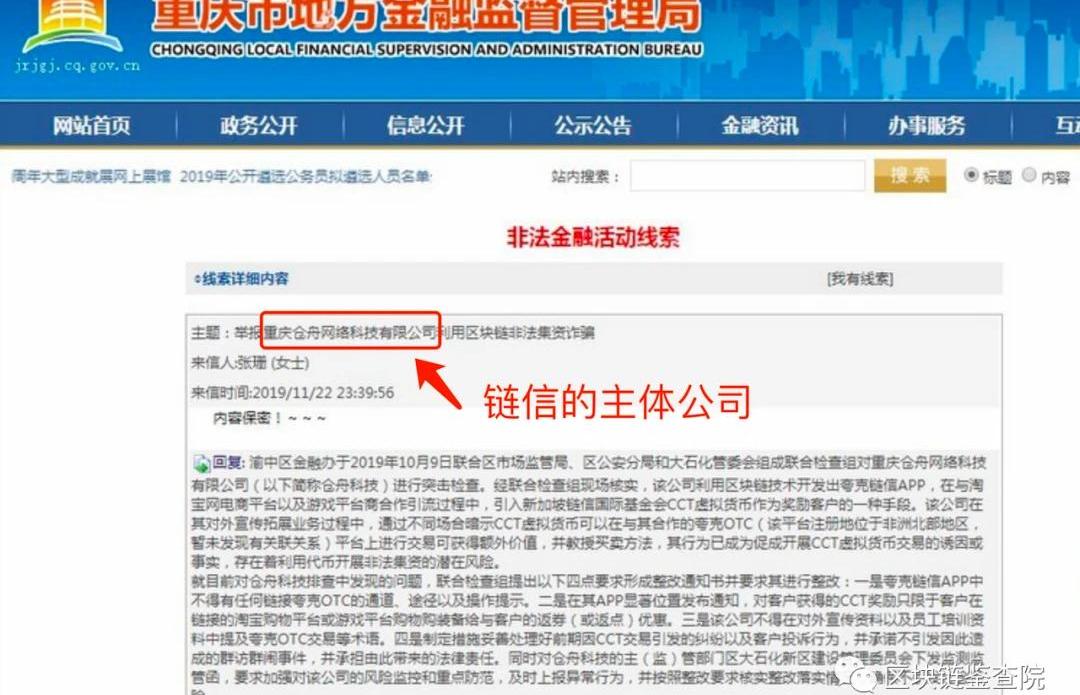 回顾链信的发展,从2019年1月开始,用户规模一直呈现爆发式增长,CCT的价格也一路水涨船高,最高的时候甚至达到了40元。但好景不长,2019年11月,有用户举报链信的主体公司利用区块链非法集资,随后渝中区金融办联合区市场监管局、区分局和大石化管委会就组成了联合检查组对仓舟科技进行了突击检查。