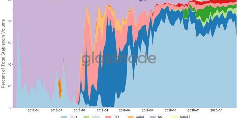 图8–ETH链上交易量与所有稳定币交易量的比率。作为以太坊生态系统中占主导地位的稳定币,USDT傲居群首。自2019年中期以来,USDT几乎没有竞争对手:2020年5月,以太坊上79.1%的稳定币交易量通过USDT结算,其次是USDC,BUSD,DAI,PAX,HUSD,其他的稳定币所占比例不到1%。
