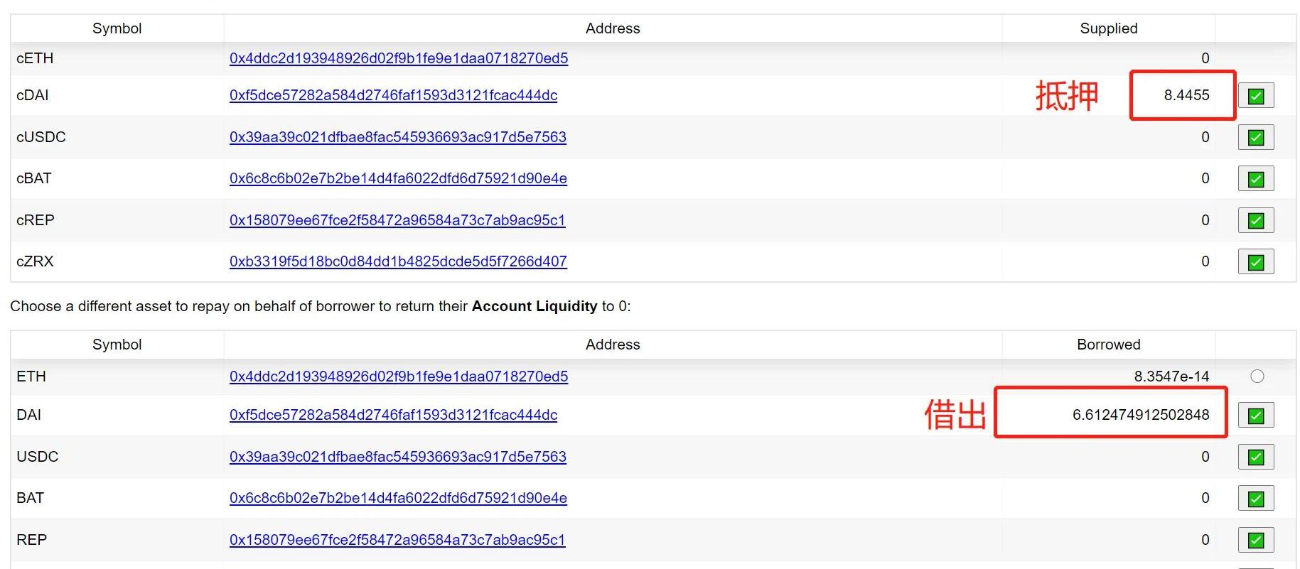 一旦找到了可清算的借款,则可以调用liquidateBorrow()合约进行清算,例如,需要以下参数:被清算账户地址清算人代偿付金额compound内关于该笔借款抵押物的合约地址,这些cToken智能合约地址可在官方FAQ找到。下面提供ZenGo研究文章内给的实例,让读者进一步了解清算过程,首先通过工具网站找到当前可以被清算的借款,