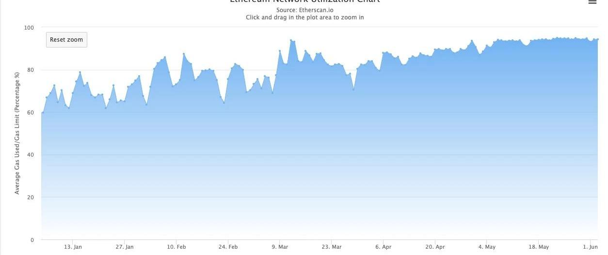 造成Gas费用上涨的根本原因,是以太坊网络利用率不断升高,处于严重的拥堵状态。Etherscan数据显示,以太坊网络利用率已经从年初的不到60%上升至90%以上;特别是近两个月,始终维持在95%左右。