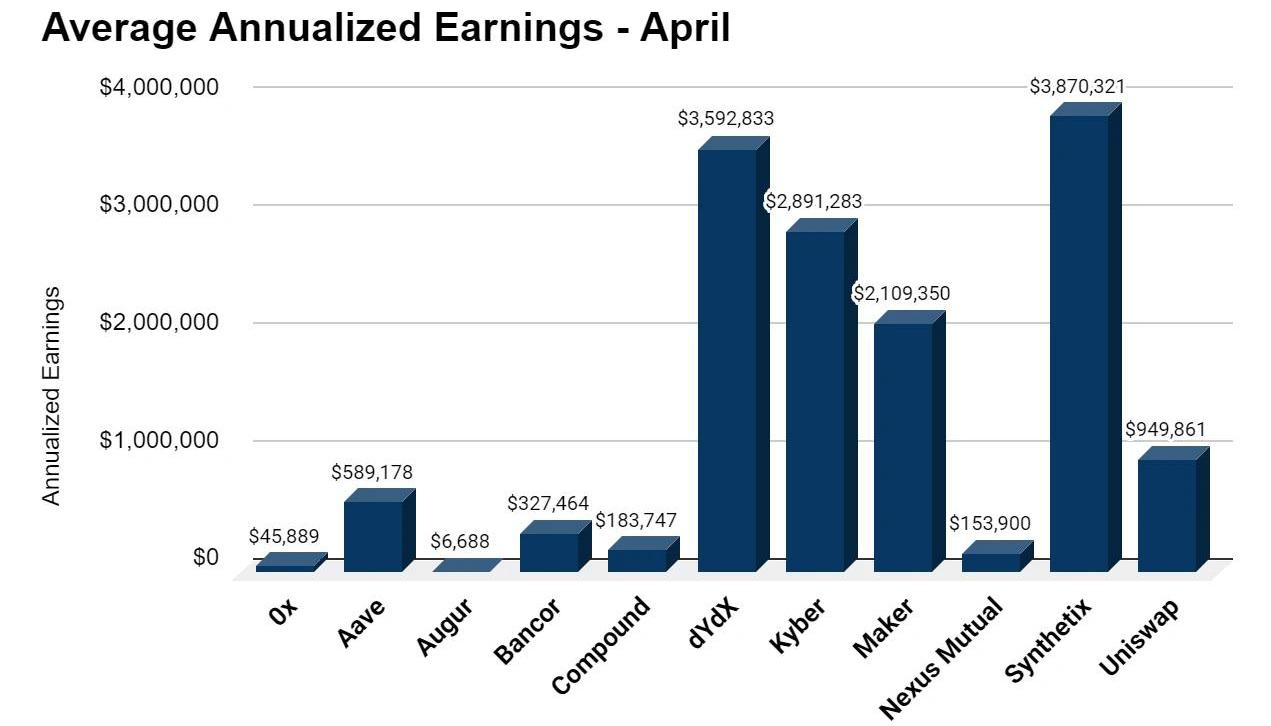 TokenTerminal根据4月数据计算的年度收入上图中,我们也可以看到Synthetix仍然是收益最多的协议。但实际上直到4月中旬,Synthetix还在解决「抢先交易」的问题,因此对于其数据要分开来看。在4月的前15天,Synthetix的年度平均收益约为600万美元;4月下半月的预期收益约为64万美元,比上半月低一个数量级。虽然收入的下降似乎是负面的,但也表明Synthetix似乎已经解决了「抢先交易」的问题,未来的数据会更加准确。Kyber(KNC)协议收益随着Maker和Synthetix边际收益递减,dYdX和KyberNetwork在DeFi领域的地位逐渐上升并逐渐处于领先地位。KyberNetwork的链上流动性协议已迅速发展成为DeFi生态系统中的佼佼者。仅在3月份,Kyber大约1.3万个地址就实现了每月近2亿美元的交易额。因此,该协议的交易量也转化为KNC代币持有者的可观收入——根据4月份交易量计算,年度收入约为289万美元。dYdX协议收益4月份收入第二高的是dYdX——支持保证金交易的去中心化交易所。通过dYdX,用户可以进行进行借贷业务以及衍生品交易,该团队最近还宣布支持BTC永续合约。dYdX的有趣之处在于,尽管其是基于DeFi协议构建的产品,但DEX的费用是属于底层公司的,而不是属于一个去中心化的生态系统代币持有者。因此,尽管dYdX运营着一个由其用户提供动力的非托管交易所,但交易费用被分配给母公司实际上使dYdX更接近于CEX,而不是DeFi协议。Uniswap协议收益在DEX上,Uniswap是DeFi收益最后的主要贡献者之一。截至4月份,Uniswap协议产生约100万美元的收益。虽然自3月初的峰值后Uniswap一直处于低迷,但该公司今年年初至今的预期收益仍增长了110%。