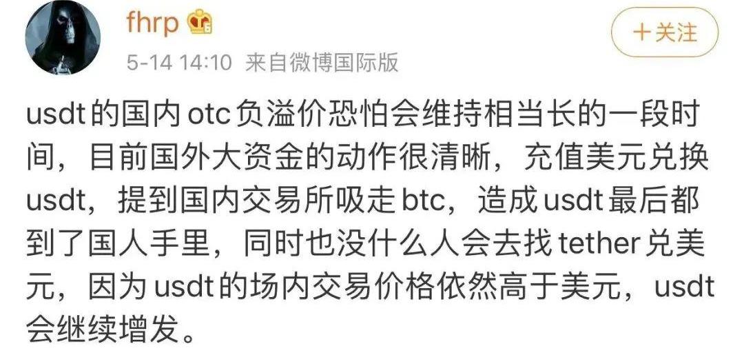 不过杨好认为这次USDT负溢价并不能反应场内资金出逃,只是因为目前场内的USDT太多了;而且大量的USDT在亚洲,亚洲的投资者们开始抛售手上的USDT,买入BTC或者ETH等其他主流资产,以规避风险。不过对于这些海外大机构而言,他们并不担心USDT出现暴雷风险,因为他们拿到USDT的那一刻就已经将USDT换成了BTC,等到时机合适再通过SPV向Tether兑换为美元。一旦USDT出现暴雷,国内投资者开始恐慌抛售USDT,换成法币或者BTC,那么这时候BTC的价格将再次被推上新高,海外这些大机构就会赚得盆满钵满,而BTC的定价权也就顺理成章地落入海外这些大机构手中。杨好还告诉Odaily星球日报,国内外市场情绪反差很大,Twitter上一片欣欣向荣的景象,海外机构都在看多,我们国内的很多机构和矿工在唱空。杨好透露,很多矿工客户都在抛售比特币。这让杨好感觉很无力,“我们自己辛辛苦苦挖出来的比特币就这样被海外投资者们低价买走,就好比以前的棉花市场,中国作为出产国,最后却没有定价权,就这样将比特币的定价权拱手让人了。”最后,杨好还呼吁国内投资者和矿工“为国囤币,为国挖矿”。虽然现在已经有投资者将手中的USDT换成BTC等主流资产,或者为求稳妥卖成法币,但是加密货币市场瞬息万变,海外大机构的行为也捉摸不定。Odaily星球日报在此提醒投资者,上述观点不构成任何投资建议,谨慎控制风险。参考资料:北京链安:《ChainsMap链上数据:单月增发超13亿,这些USDT都去了哪里?》北京链安:《ERC20USDT增发分析:再发超10亿,绝大多数流入币安》
