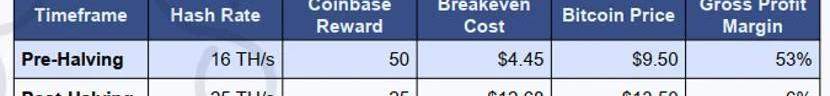 从上表中可以看出,比特币第二次区块奖励减半之后,网络算力上升到1,580,000TH/s,区块奖励从25BTC减少至12.5BTC,收支平衡成本从217美元上涨到453美元,虽然比特币价格从420美元上涨到680美元,但矿工的毛利润率却从48%下跌至33%。第三次减半:2020年