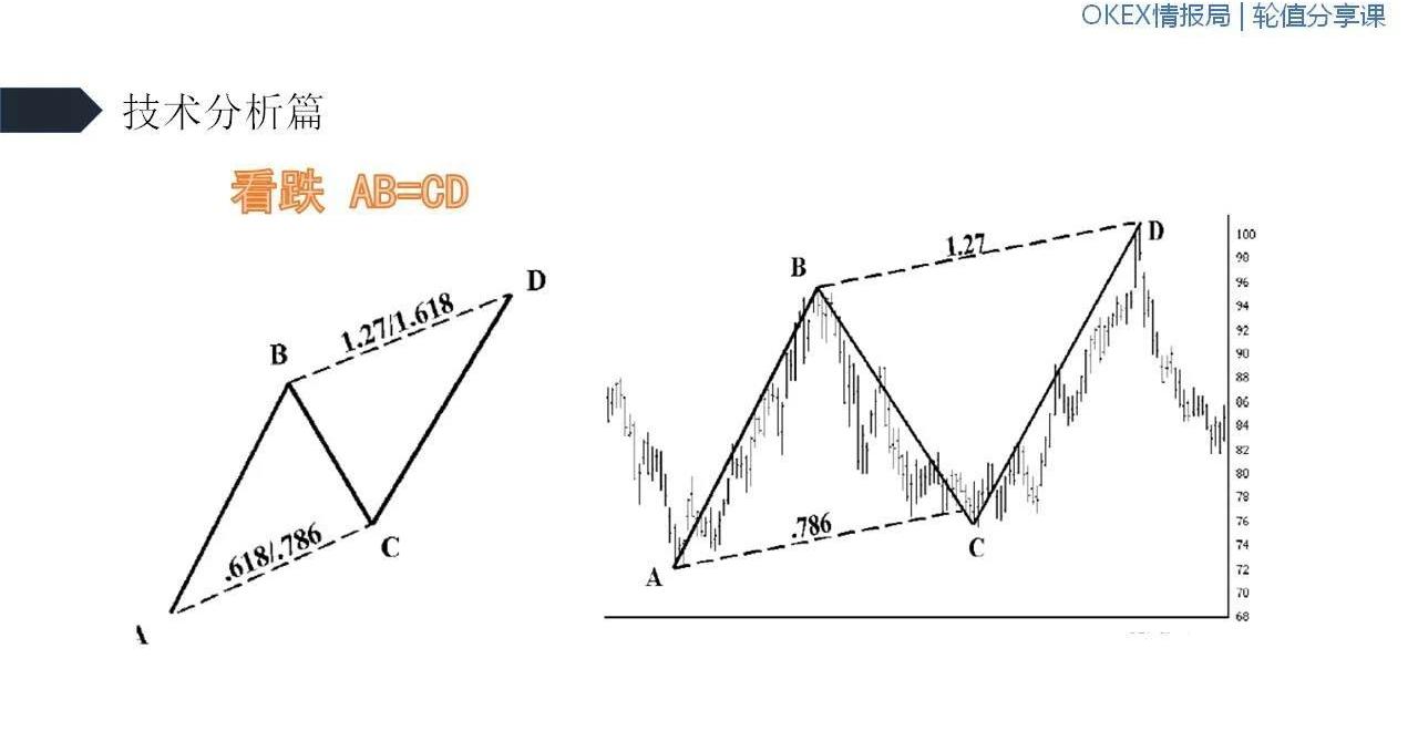 以上两张图是AB=CD的形态,第一个是看涨,第二个是看跌。“蝴蝶形态”以斐波那契数列作为结构基础,理想状态下,如果我们在走势图中确认了A、B、C、D各点,我们就可以判断位于D点之后的翻转行情。BC的回调位是AB的0.618或者0.786,CD是BC的1.27或者1.618。
