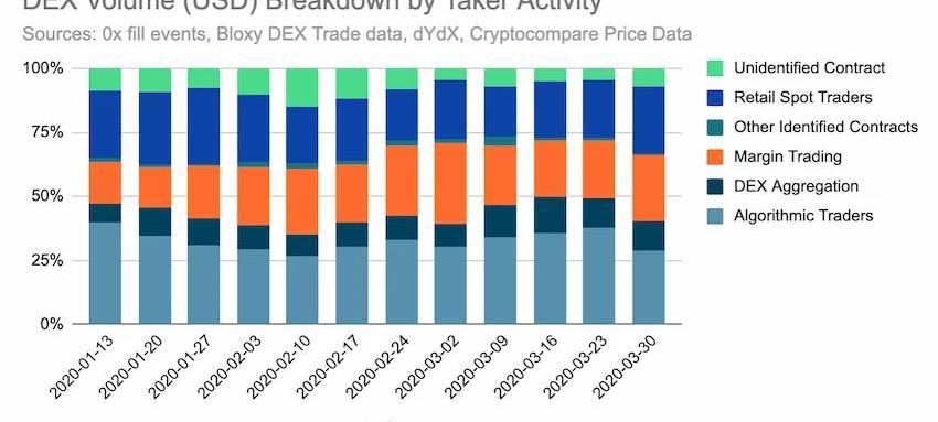 这是OurNetwork对DeFi明星项目进行了回顾和分析,包括0x、Uniswap、Kyber、dYdX。0x数据科学家AlexKroeger通过数据分析确定并量化了DEX流动性的四个主要用例,分别是:散户的现货交易,例如KyberSwap、Uniswap和Tokenlon等,近一周占比26%;保证金交易,目前由dYdX主导,还有Nuo等其他DApp,近一周占比26%;DEX聚合,在单笔交易中利用多个DEX的流通性来实现更好的价格发现,例如1inch.Exchange、DEX.AG等,占比11%;算法交易,跨DEX协议套利、清算借贷协议、跨DEXs和中心化交易所套利等,占比29%。