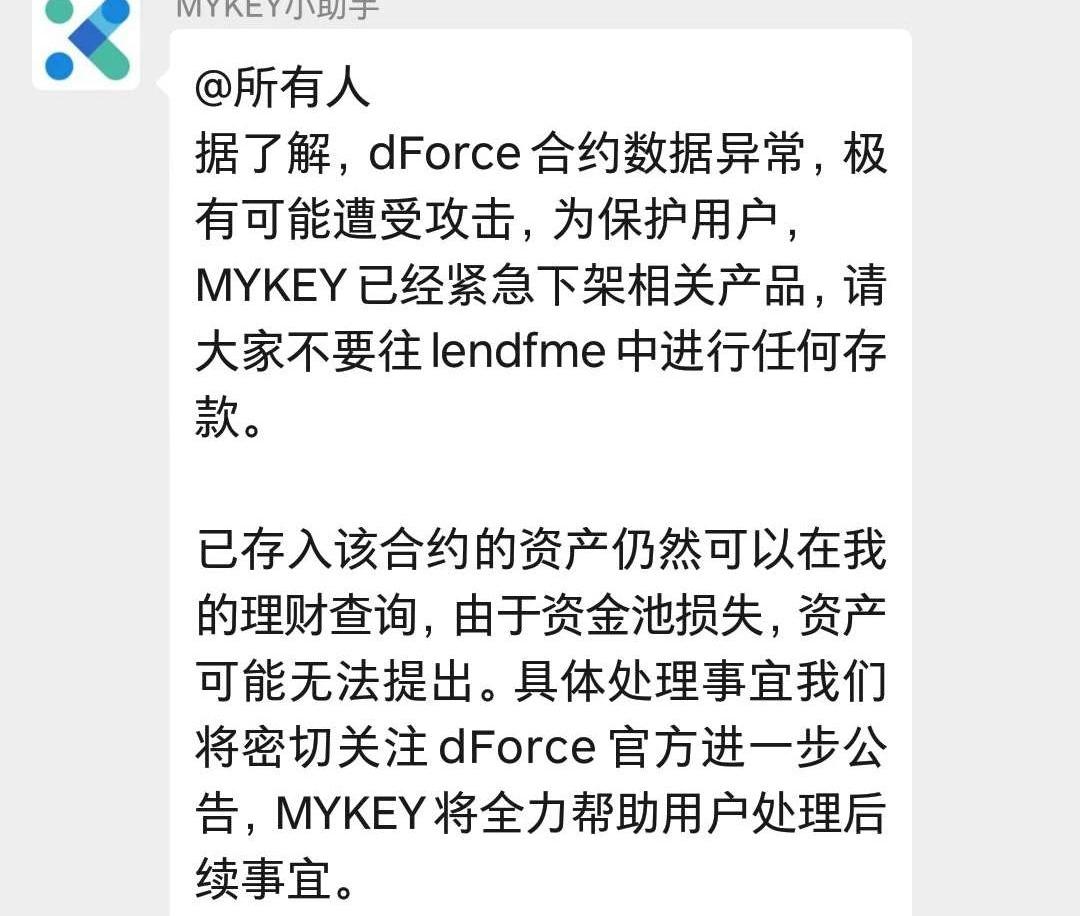 我存了远不止1000U……不过,一码归一码,这个事跟MYKEY没关系。目前我了解下来,是开发者那边的问题。lendf.me官方在电报群里第一时间出来说还在调查,让大家不要再往智能合约里面存币: