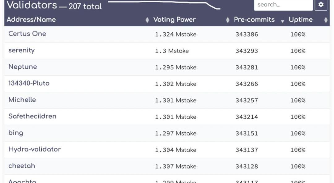 图中红色部分代表我们运行的节点基于Hubble关于pre-commits的数据,总数前10名中我们的节点有9个。只有CertusOne超过了我们节点的数据。类似的,我们的全部70余个节点几乎都排在总pre-commit数量的前80名。